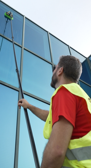 Limpieza especializada de superficies en altura como fachadas, techos y ventanas difíciles de alcanzar.